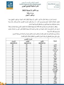هذا، ومن المتوقع أن تنتهي موجة الحرّ مع حلول يوم الجمعة 25 جويلية، حيث يُنتظر تسرب تيارات هوائية شمالية معتدلة تعيد الأجواء إلى طبيعتها تدريجيًا.